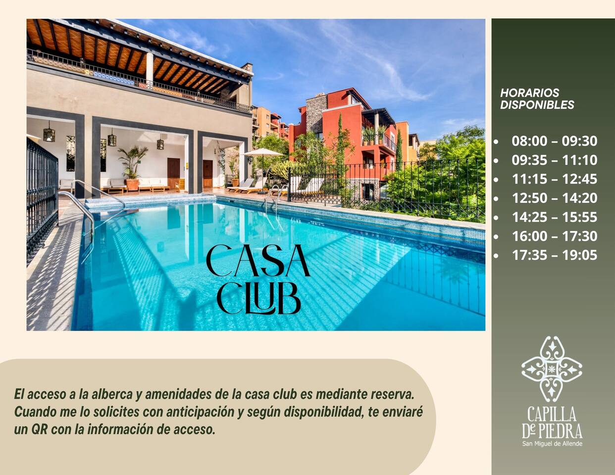 Acceso amenidades para huéspedes (Casa Club por reserva) 🏊 Alberca | 🛁 Jacuzzi | 🌬 Vapor/Sauna | 💆 Spa | 💪 Gimnasio Como cortesía, ofrecemos acceso a las áreas comunes del complejo (administradas por el residencial). 📲 Para usar la Casa Club, es indispensable solicitar el acceso para recibir código QR. 🛎️ Horarios disponibles (por reserva): • 08:00 – 09:30 • 09:35 – 11:10 • 11:15 – 12:45 • 12:50 – 14:20 • 14:25 – 15:55 • 16:00 – 17:30 • 17:35 – 19:05 ⚠️ Información importante • El alojamiento no cuenta con alberca privada; todas las amenidades son de Casa Club. • La disponibilidad/operación de amenidades depende de la administración del residencial y puede variar.