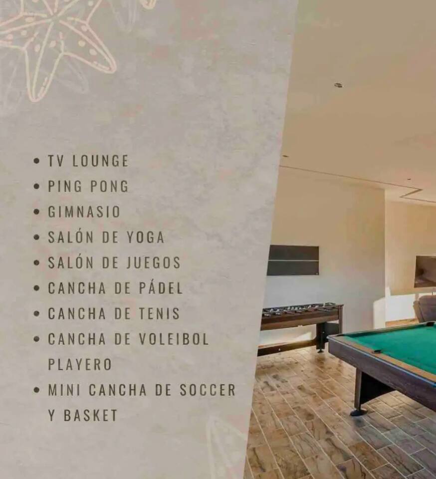 Amenidades tipo resort (Casa Club + Club de Playa) El acceso a amenidades es gratuito y exclusivo para huéspedes registrados, sujeto a reglamento interno y a la disponibilidad que determine la administración del complejo. 🏖 Club de Playa (a ~3 min caminando, cruzando la calle) • Restaurante y bar (servicio del club) • Alberca, camastros y zona de descanso • Acceso a playa Importante (políticas del club): • No se permite ingresar con alimentos o bebidas externas. • En temporada baja, los martes el club puede no ofrecer servicio de consumo; aun así, el área puede funcionar como vía de acceso a playa pública (según operación del día). 🏋️ Casa Club / Áreas comunes • Alberca y camastros • Gimnasio • Mesa de billar, futbolito y mini sala de TV • Canchas (tenis, pádel y voleibol) reservables sin costo (según disponibilidad) • Spa con reservación (costo adicional) ⏰ Horario general de amenidades: Lunes a domingo 8:00 am – 10:00 pm (22:00 hrs) (Puede variar por administración.)